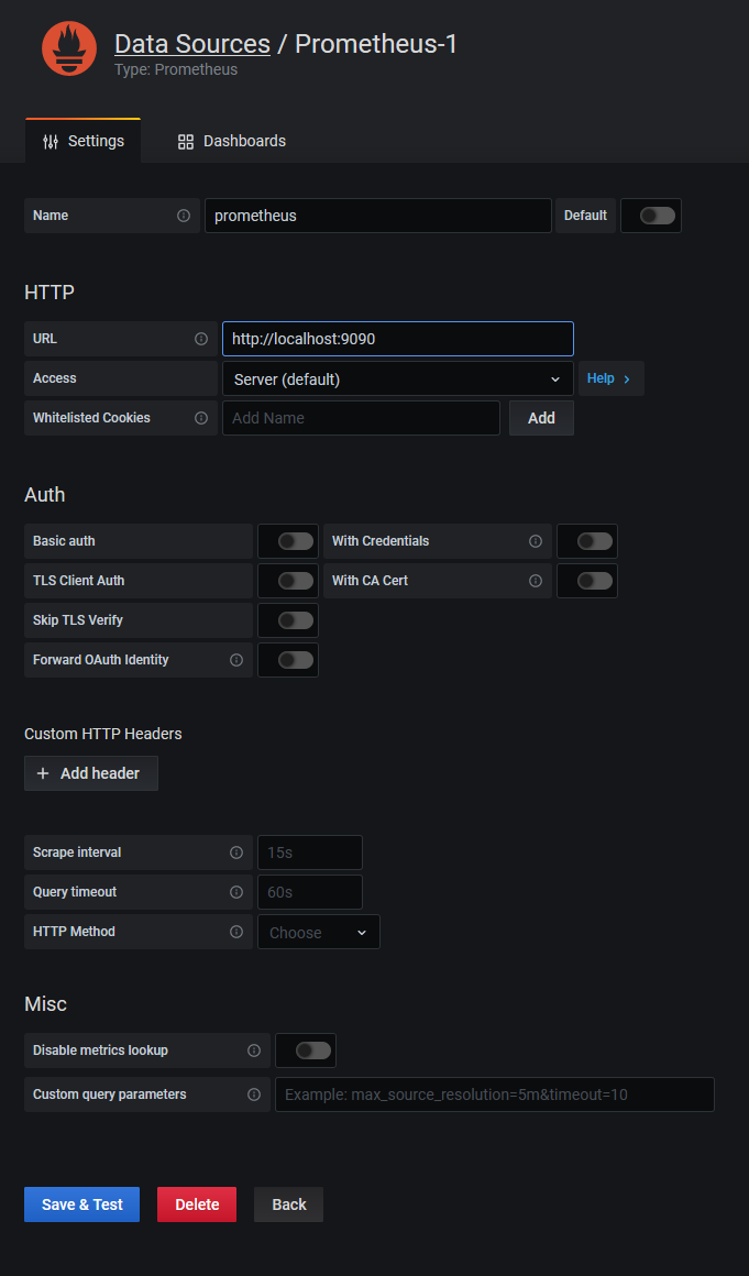 In the next step, fill out the form as below. Please be careful: prometheus must be written lowercase! Otherwise your dashboard won't work!